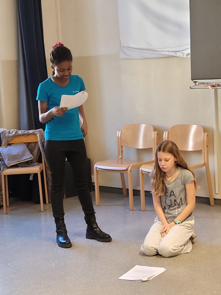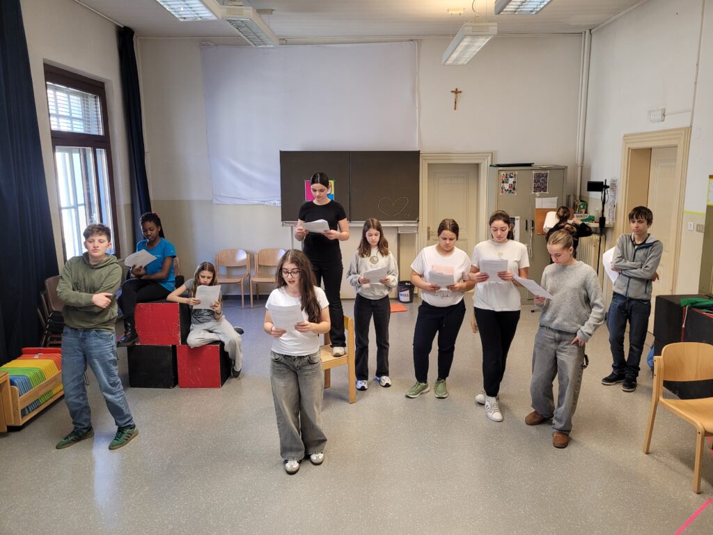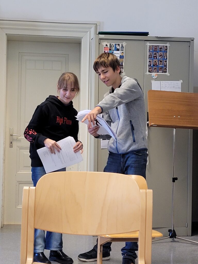 In einer Schreibwerkstatt unter der Leitung von Theaterpädagogin Nadja Tröster entwickeln interessierte Schüler:innen der 2. und 3. Klassen der Mittelschule Josef v. Aufschnaiter selbst ein Theaterstück. Entstanden ist die Geschichte „Ein Platz voller Möglichkeitsmenschen“: